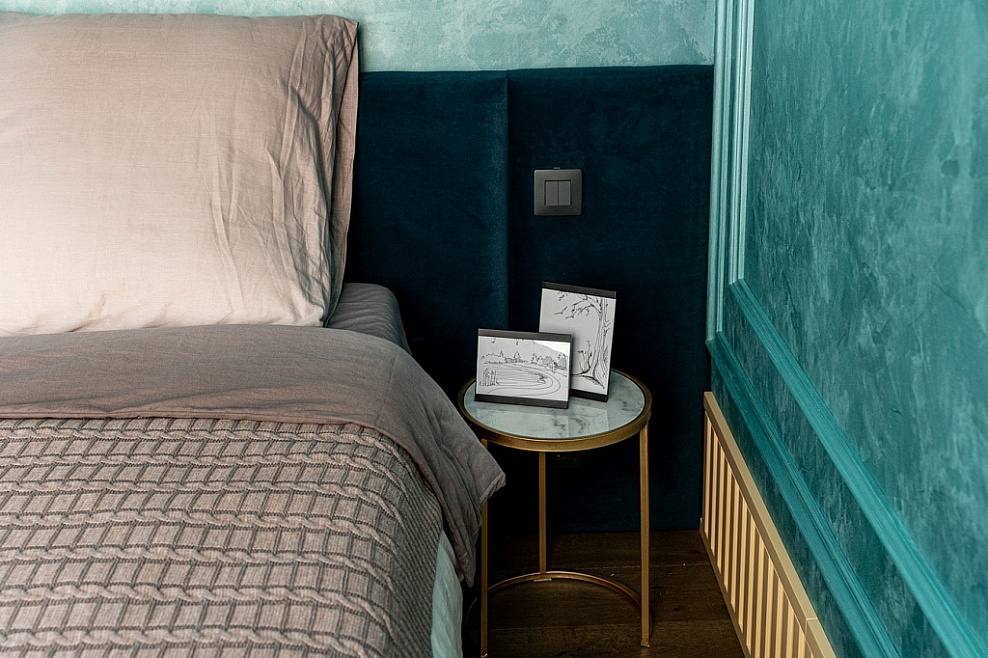 Основным цветом спальни стал сине-зеленый. Его можно увидеть на стенах, потолке, батарее, кровати, настенном светильнике в форме луны. Украшением пространства также стали подвесные светильники, которые расположили в боковых частях комнаты. Напольным покрытием была выбрана паркетная доска.